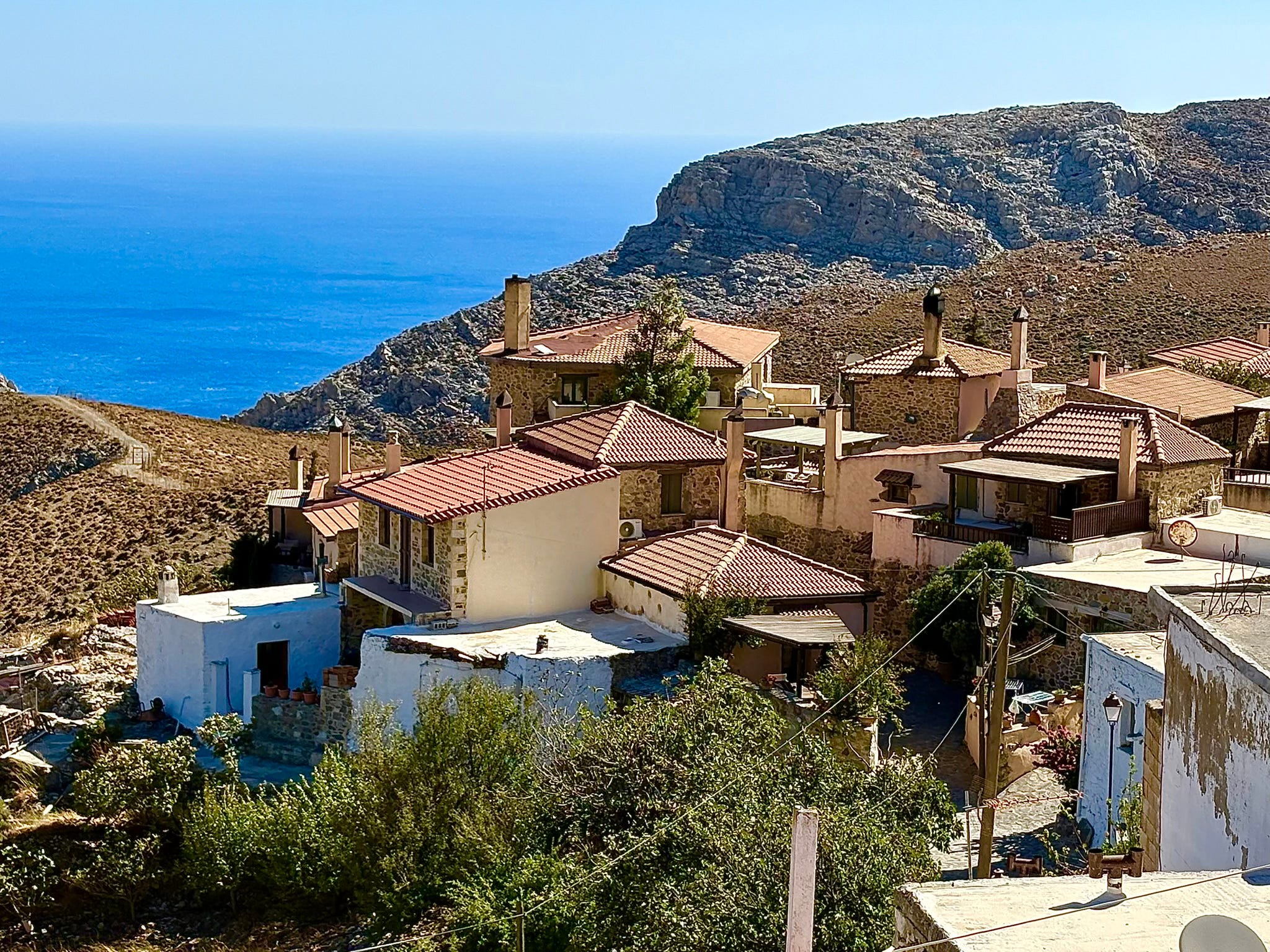 But life up here does feel isolated and must require meticulous planning, especially in the winter. There’s no shop, and the nearest town of any size, Agioi Deka on the Messara Plain, is forty minutes drive away, down a road that our guidebook describes as ‘one of the most exciting on Crete’ – code for ‘very high and pretty scary’!