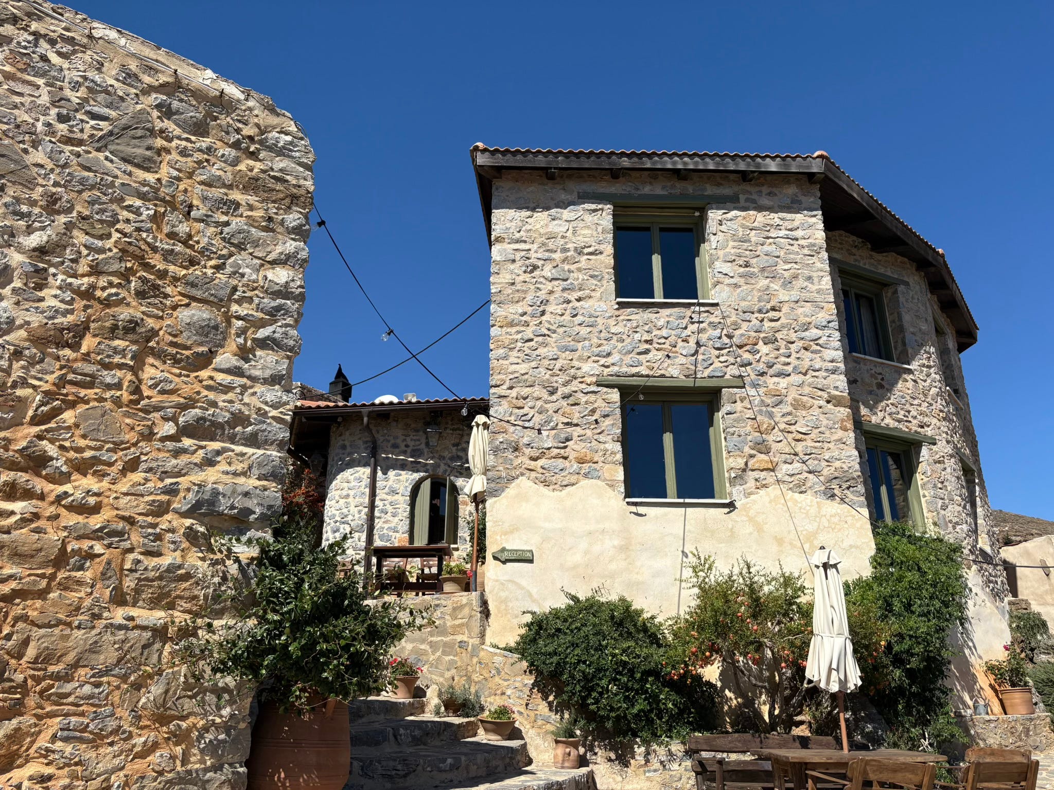 When my husband Craig and I explore the village early the morning after our arrival, the wind has dropped and the scent of roses is so strong that it hangs heavy in the narrow alleyways. Pomegranate trees are laden with fruit, there are inviting, sunny spots to sit around almost every corner - and Thalori’s infinity pool glistens on the edge of a panorama that falls to the sea 750 metres below.