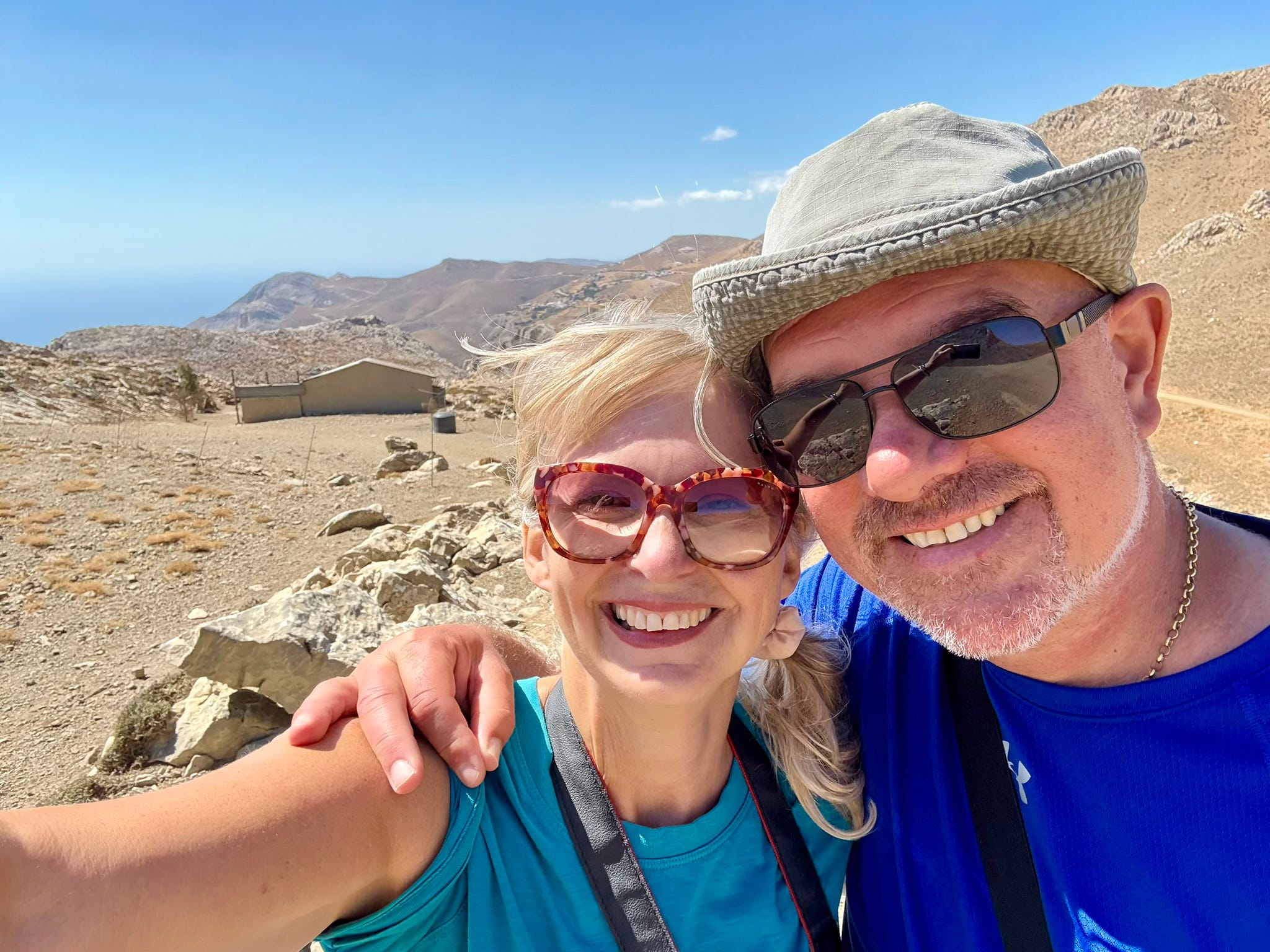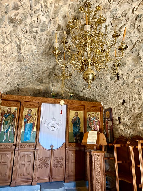At the peak of our walk, the loose, stony climb and the view literally take our breath away. A huge fishing vessel seems suspended between heaven and earth, in a place where the Libyan Sea and the sky merge together with no horizon. We’re so high, the light seems miraculous - all human life is very far away - and it’s easy to understand this as a place where people came to be closer to God.