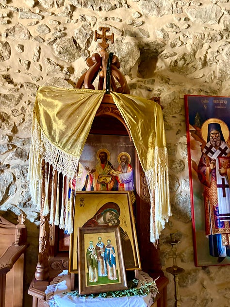 The day quickly turns humid and we stop to drink water in the grounds of the 14th century Trion Ierarchon Filagri (Three Hierarch’s) church, with the remains of a ruined monastery arranged in a circular labyrinth of stones around it. This was Crete’s first ‘university’ – a place that attracted scholars from across the island and offered instruction in medicine, philosophy, theology, astronomy and grammar. It was also a scriptorium where the message of the Christian gospels, arriving here in Europe from the East, was written and copied. Surviving examples of the work made here are held in libraries around the world, and are highly prized.